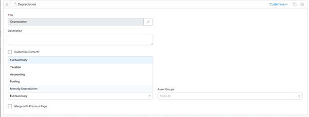 You can now select a monthly depreciation report when setting up your financial statements. Navigate to the Reports screen and either create a new report or open an existing one. When in a report, click on the Report Pages tab and select a Add Page, add a Depreciation page and select the ‘Monthly’ report type in the dropdown.