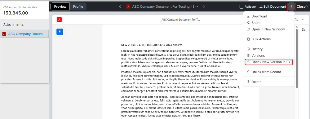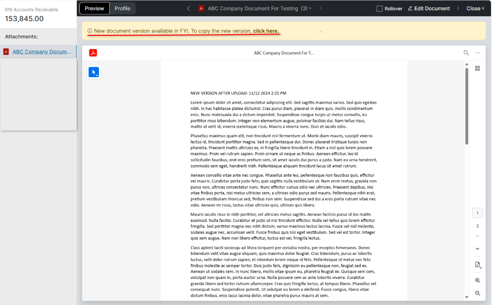 If a new version is detected, you’ll see a clear notification: “New document version available in FYI/iManage. To copy the new version, click here."